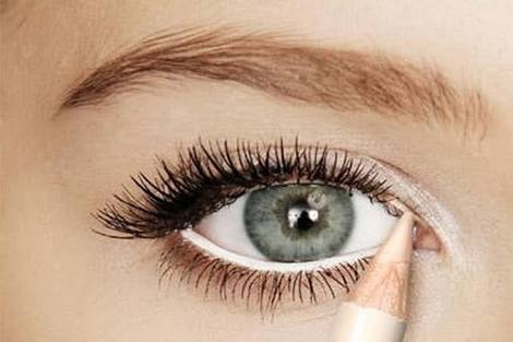 - في داخل الجفن السفلي ارسمي خطًا بقلم الآي لاينر الأبيض الجيري فهو يساعد بشكل كبير على منحك عيونًا واسعة.