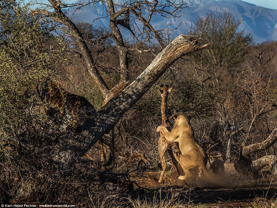 وأشارت الصحيفة إلى أن تلك المعركة وقعت في غابة بجنوب إفريقيا، مشيرة إلى أن الزرافة كان تتجول برفقة والدتها في الغابة، عندما لاحظ وجودهما مجموعة أسود جائعة كانت تتعلم الصيد، وفي البداية حاولت الزرافة الاختباء خلف والدتها من الأسود، لكن غريزتها الدفاعية جعلتهت تحاول الدفاع عن نفسها وتنقض على أسد جاء لافتراسها وتركله في وجهه، ويدخل الاثنان في شجار استمر لساعتين.