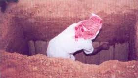 وأضاف: وصفة اللحد: أن يحفر في أسفل جدار القبر الأقرب إلى القبلة مكانًا يوضع فيه الميت على جنبه الأيمن مستقبل القبلة، ثم تسد هذه الحفرة بالطوب اللبن خلف ظهر الميت، ثم يهال التراب.