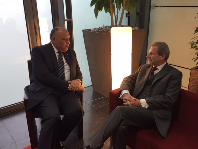 التقى سامح شكري وزير الخارجية على هامش مشاركته في مؤتمر السلام في الشرق الاوسط بباريس مع يوهانس هان المفوض الأوروبي لسياسة الجوار.
