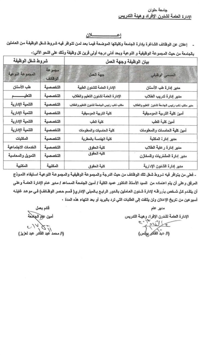 أعلنت الإدارة العامة لشئون الأفراد وهيئة التدريس بجامعة حلوان، عن حاجتها لشغل وظائف متعددة، على أن يتوفر في المتقدم شروط الوظيفة من حيث الوظيفة والنوعية ودرجة أولى قرين على الأقل لكل وظيفة.