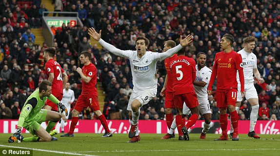 تقدم سوانزي سيتي بهدفين نظيف علي منافسه ليفربول في المباراة التي تجمعهم علي ملعب الأنفيلد في أطار مباريات الجولة الـ22 من عمر مسابقة الدوري الأنجليزي "البريمرليج".