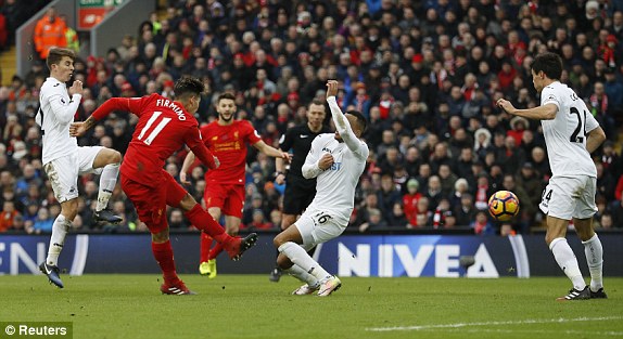 تمكن نادي ليفربول من تسحيل الهدف الثاني والتعادل، وبعدها بثلاث دقائق نجح سوانزي في إضافة الهدف الثالث في المباراة التي تجمعه مع منافسه سوانزي سيتي علي ملعب الانفيلد في إطار منافسات الاسبوع الـ22 من عمر مسابقة الدوري الانجليزي"البريمرليج".