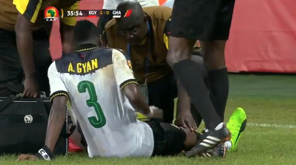 شهدت الدقيقة 37 من مباراة مصر وغانا إصابة أسامواه جيان، مهاجم البلاك ستارز من إصابة بالعضلة الضامة، خرج على أثرها من ملعب المباراة.