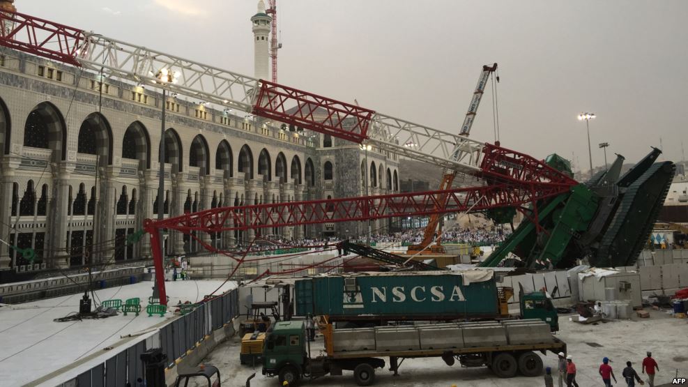 واستندت هيئة التحقيق والادعاء العام إلى أن نتائج التحقيق التي رفعت للجهات العليا ذكرت أن السبب الرئيسي للحادث هو تعرض الرافعة لرياح قوية، بينما هي في وضعية خاطئة وأن وضعية الرافعة تعتبر مخالفة لتعليمات التشغيل المعدة من قبل المصنع، والتي تنص على إنزال الذراع الرئيسية عند عدم الاستخدام أو عند هبوب الرياح ومن الخطأ إبقاؤها مرفوعة، إضافة إلى عدم تفعيل واتباع أنظمة السلامة في الأعمال التشغيلية، وعدم تطبيق مسؤولي السلامة عن تلك الرافعة التعليمات الموجودة بكتيب تشغيلها يضاف إلى ذلك ضعف التواصل والمتابعة من قبل مسؤولي السلامة بالمشروع لأحوال الطقس وتنبيهات رئاسة الأرصاد وحماية البيئة وعدم وجود قياس لسرعة الرياح عند إطفاء الرافعة، بالإضافة إلى عدم التجاوب مع العديد من خطابات الجهات المعنية بمراجعة أوضاع الرافعات وخاصة الرافعة التي سببت الحادثة، وتحميل المقاول (مجموعة بن لادن السعودية) جزءًا من المسؤولية عما حدث لما أشير إليه من أسباب وإعادة النظر في عقد (الاستشاري شركة كانزاس) ومراجعة أوضاع جميع الروافع الموجودة بالمشروع، والتأكيد على توفير جميع متطلبات واحتياطات الأمان والسلامة فيها طبقا لما اعلن من جهات رسمية.