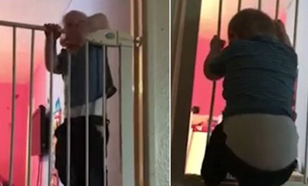 نشر صحيفة "ديلي يمل" البريطانية مقطع فيديو يظهر طفلا رضيعا يتسلق بوابة حديدية تتكون من بابين وضعتهما والدته، حتى لايخرج من غرفته أثناء انشغالها بأعمال المنزل.