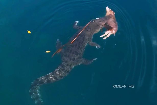 أظهر مقطع فيديو التقطته طائرة بدون طيار فوق محيط، تمساح عملاق يسبح في المياه وبين فكيه خنزير ميت؛ وفي البداية يبدو التمساح كظل مظلم تحت الماء، لكنه ما يلبث أن يصعد إلى سطح الماء كاشفا عن الحيوان الميت في فمه.