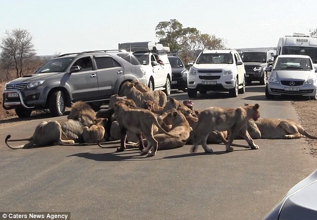 نشرت صحيفة "ديلي ميل" البريطانية مقطع فيديو يظهر مجموعة أسود تضم 18 أسدا قطعت الطريق، وأعاقت حركة المرور تمامًا على أحد الطرق فى متنزه "كروجر" الوطني بجنوب افريقيا.بعدما افترس القطيع الجائع من الأسود جاموس بري، وقرروا التجول بحثا عن وجبات أخري، بعدما اشتد عليهم الجوع تمامًا.