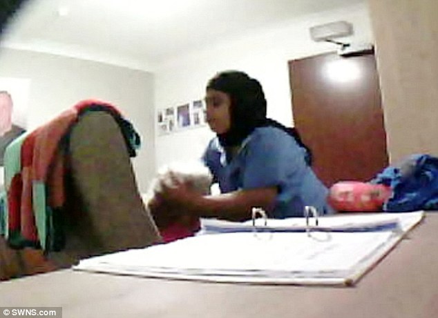 وفي لقطة أخرى، ظهرت إحدى العاملات وهي تقوم برش مادة في وجه العجوز، وتمزح قائلة "أنه أفضل من البراز"، وذلك عندما أخبرتها زميلتها أن المادة دخلت في فم المسنة، ومازال التحقيق في تلك الواقعة جاريا.