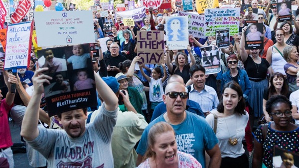 وفي سيدني حمل المتظاهرون لافتات تقول "تعذيب اللاجئين.. عار على استراليا" و "لا جدران.. لا مخيمات.. لا حظر".