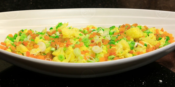 * يضاف اليه الكزبرة الخضراء مع البصل الاخضر المقطع و تقدم دافئة مع الزبيب بالهنا .