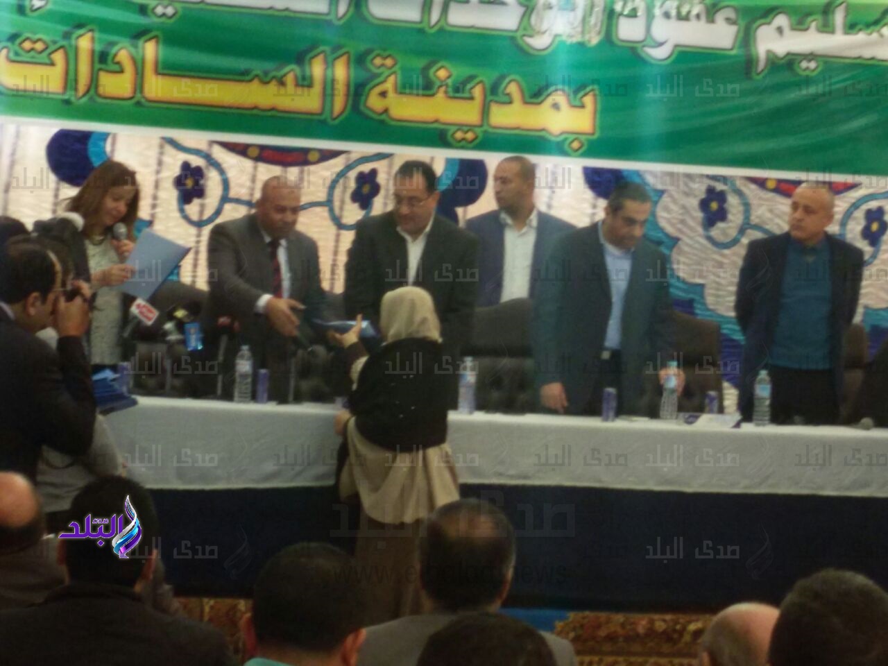وقام الوزير بتسليم عقود الإسكان الاجتماعى للمستحقين بمدينة السادات خلال احتفال داخل جهاز تنمية السادات، وذلك لمحدودى الدخل "المليون وحدة" بمحافظة المنوفية ومدينة السادات.