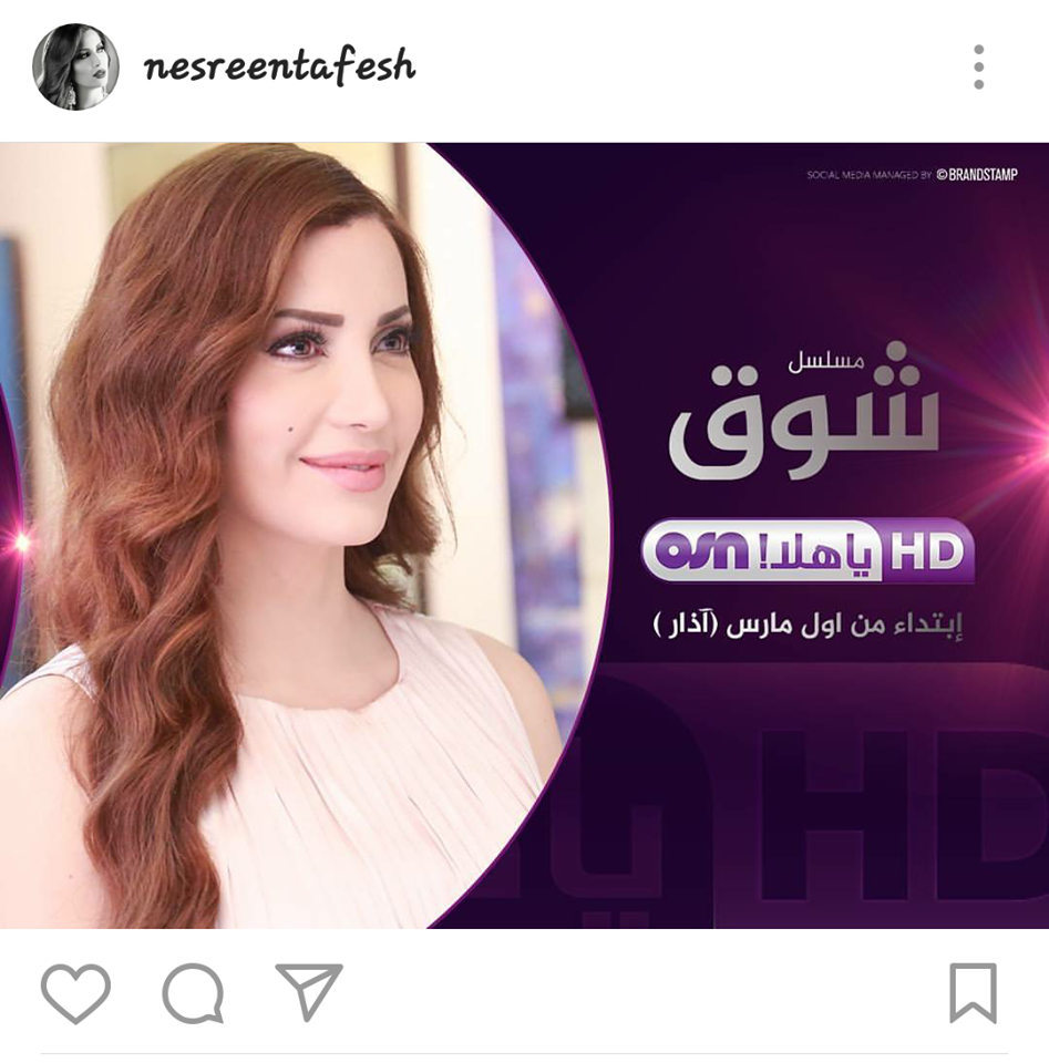 نشرت الفنانة نسرين الطافش صورة لمسلسلها الشوق وذلك من خلال موقع التواصل الاجتماعى "إنستجرام" وعلقت عليها: مسلسل شوق ابتداء من أول مارس على قناتي osn المشفرة.