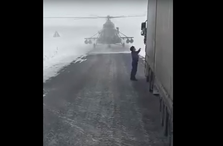 نشرت شبكة "روسيا اليوم" الإخبارية، الأربعاء، فيديو طريف يظهر قائد مروحية عسكرية وهو يهبط في أحد الشوارع، وينزل من المروحية ليسأل سائق شاحنة عن الاتجاه إلى أقرب مدينة، قبل أن يعود للمروحية ويقلع بها من جديد.
