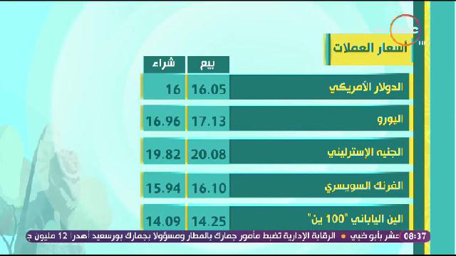 أما أسعار متوسط العملات بالجنيه المصري، فقد سجل الدولار الأمريكي 16 جنيها للشراء و16.05 جنيه للبيع، واليورو 16.96 جنيه للشراء و17.13 جنيه للبيع، والجنيه الإسترليني 19.82 جنيه للشراء و20.08 جنيه للبيع، الفرنك السويسري 15.94 جنيه للشراء و16.10 للبيع، والين الياباني "100 ين" يسجل 14.09 جنيه للشراء و14.25 للبيع.