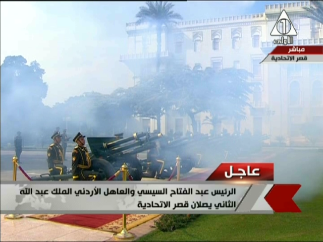 أطلقت المدفعية 21 طلقة نارية في الهواء ترحيبًا بالعاهل الأردني الملك عبد الله الثاني، في مقر رئاسة الجمهورية بقصر الاتحادية في مصر الجديدة، ضمن المراسم الرسمية لاستقباله.