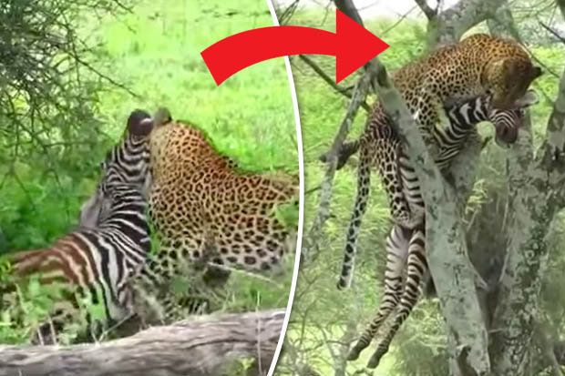 نشرت صحيفة "ديلي ستار" البريطانية فيديو يرصد لحظة انقضاض فهد على حمار وحشي والفتك به قبل أن يقوم بجر جثته ويصعد بها إلى أعلى شجرة.
