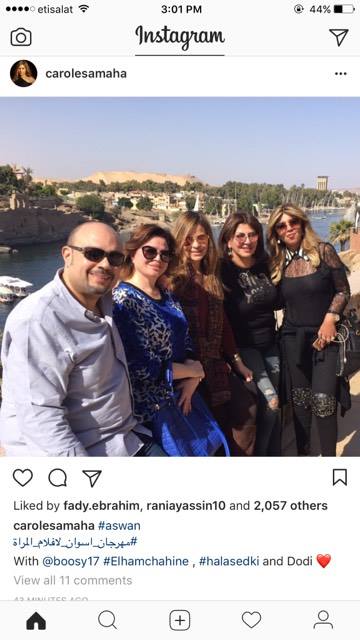 نشرت الفنانة كارول سماحة من خلال صفحتها الشخصية علي موقع التواصل الاجتماعي "إنستجرام" صورة أثناء تواجدها في مهرجان أسوان الدوليلأفلام المرأة برفقة كل من الفنانة إلهام شاهين وهالة صدقي والإعلامية بوسي شلبي.