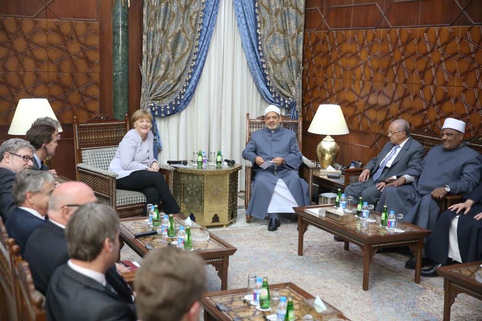 ورحب الإمام الأكبر بالمستشارة الألمانية في رحاب الأزهر الشريف، مشيدًا بالعلاقات الوطيدة التي تجمع بين مصر وألمانيا بصفة عامة والأزهر بصفة خاصة، معربا عن تقديره لموقف "ميركل" الإنساني من الفارِّين من مناطق الحروب والنزاعات في الشرق، مشيرًا إلى أن الأزهر أصدر بيانًا شكر فيه المستشارة ميركل على أريحيتها الكريمة تجاه الإسلام والمسلمين حين شاركت سيادتها في مظاهرات برلين المندِّدة بالإسلاموفوبيا.