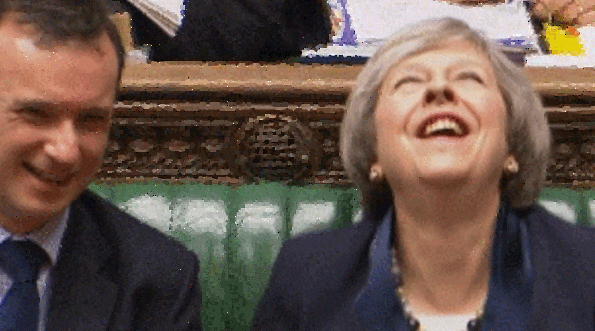 ولكن ما جذب انتباه البريطانيين أكثر من خطة التقشف، هو الضحك الهستيري الغير مبرر لرئيس الوزراء، وتابعت "ماى" الضحك الغريب أثناء إلقاء كلمة "جيريمي كوربينط رئيس حزب العمال المعارض، وبدأت فى تحريك رأسها بطريقة غريبة للغاية صدمت الحضور والمتابعين، وكأنها تحت تأثير شىء ما.