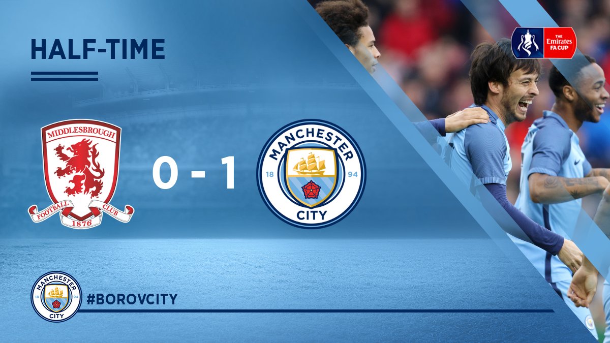 أنهى مانشستر سيتي الشوط الأول متقدما على ميدلسبرة بهدف نظيف خلال اللقاء الذى يجمعهما ضمن ربع نهائى كأس الاتحاد الإنجليزى لكرة القدم على ملعب ريفرسايد ستديوم.