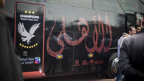 توجه الأتوبيس الخاص بنقل لاعبي النادي الأهلي من فندق الإقامة فى طريقه الي استاد السلام استعدادًا لمباراته اامام بيدفيست الجنوب أفريقي.
