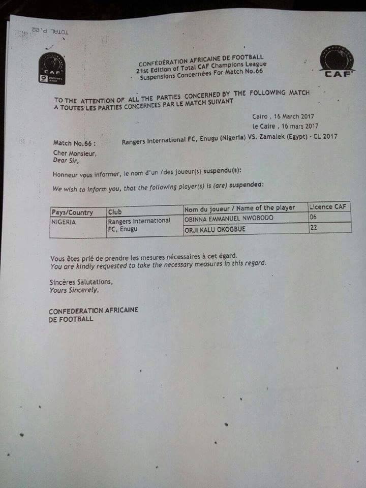 قرر الاتحاد الأفريقي لكرة القدم "كاف" إيقاف لاعبين من صفوف نادي رينجرز النيجيرى خلال مباراة الزمالك يوم الأحد المقبل، في إياب دور الـ 32 لدورى أبطال أفريقيا وهما أوبينا نووبودو و أورجى أوكاجبيو لحصولهما على الإنذار الثاني.