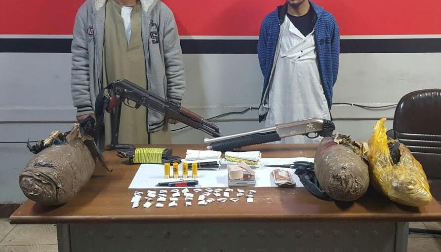 وتم ضبط المدعو محمود .ع.ف 27 سنة - عاطل ومقيم بدائرة قسم أول أسوان والسابق ضبطه واتهامه في عدد (7) قضايا متنوعة " سرقة مسكن - مخدرات "... أخرهم القضية رقم ( 2805 / 2016 ) جنح قسم أول أسوان " سرقة " وبحوزته سلاح ناري " بندقية خرطوش عيار 12 مللي " تركي الصنع ، و 4 طلقات من ذات العيار ، وكمية من نبات البانجو المخدر تزن (300) جرام ، وجارى تحرير المحاضر اللازمة لهم .