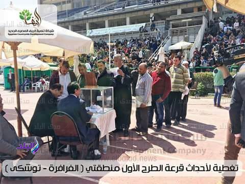 بدأت اليوم باستاد المقاولون العرب اجراءات القرعة العلنية اليدوية لتوزيع 5 آلاف فدان من اراضي المرحلة الاولى لمشروع المليون ونصف فدان بمناطق الفرافرة وتوشكى، على الشباب وصغار المزارعين، بحضور ومشاركة الأشخاص المفوضين عن المجموعات المتقدمة، والمهندس عاطر حنوره رئيس شركة الريف المصري ومندوبي وزارة التضامن الاجتماعي والأجهزة الرقابية. وشهدت القرعة حضور مكثف من المتقدمين واسرهم، وتدافع لحضور الأجراءات بعد رفض المنظمين دخول كافة المتقدمين والاكتفاء فقط بموكليهم.