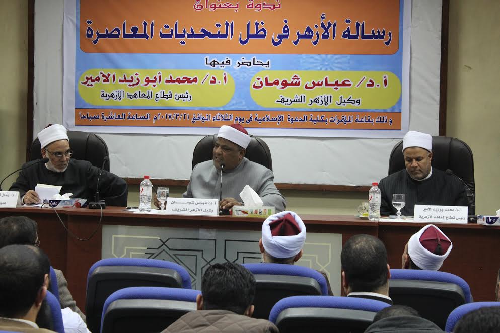 نظمت كلية الدعوة الإسلامية جامعة الأزهر في إطار موسمها الثقافي بالتعاون مع المنظمة العالمية لخريجي الأزهر، ندوة ثقافية تحت عنوان "رسالة الأزهر في ظل التحديات المعاصرة"، اليوم، الثلاثاء، حاضر فيها الدكتور عباس شومان، وكيل الأزهر، والدكتور محمد أبوزيد الأمير، رئيس قطاع المعاهد الأزهرية، بحضور عدد كبير من طلاب الجامعة.