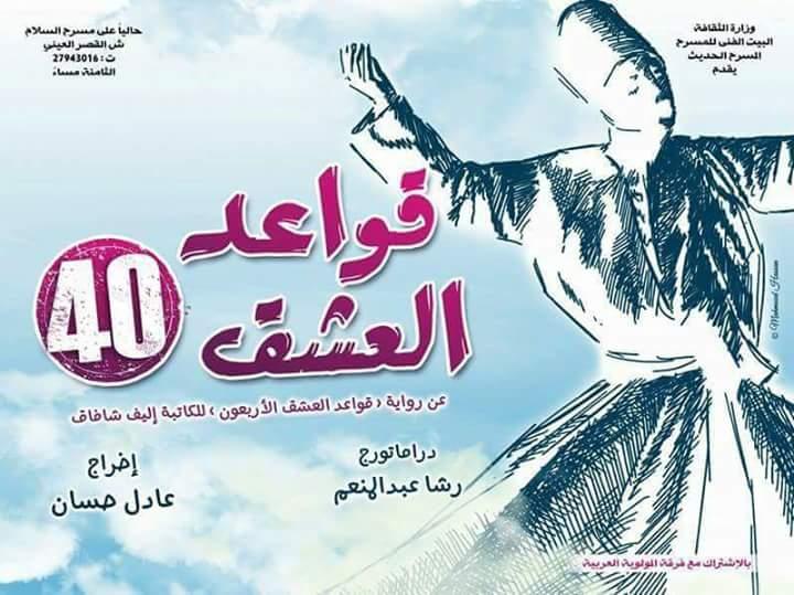 العرض المسرحي "قواعد العشق الـ40" عن رواية للكاتبة إليف شافاق، دراماتورج وإشراف على الكتابة رشا عبد المنعم، وشارك في الكتابة ياسمين إمام، وخيري الفخراني، وبطولة بهاء ثروت، وفوزية، وعزت زين، ودينا أحمد، وهاني عبد الحي، ومحمد عبد الرشيد، وإيهاب بكير، وهشام علي، والمطربة أميرة أبو زيد، والمنشد سمير عزمي، بمشاركة فرقة المولوية العربية، وموسيقى وألحان محمد حسني، وديكور مصطفى حامد، وإضاءة إبراهيم الفرن، وأزياء مها عبدالرحمن، وإخراج عادل حسان.