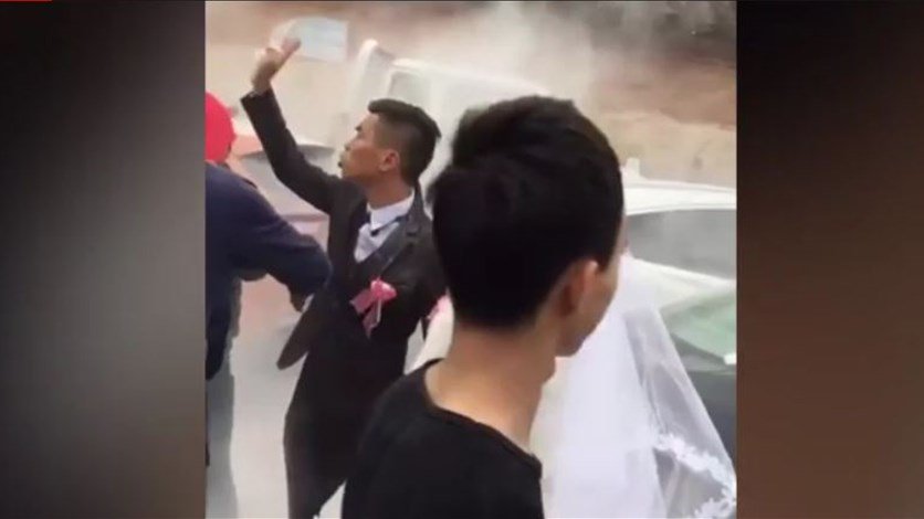 نشرت صحيفة ميرور البريطانية مقطع فيديو وثق لحظة تعرضت إشبينة عروس في حفل زفاف إلى الرش بمطفأة حريق في حفل الزفاف بمقاطعة قوانجدونج بجنوب الصين.