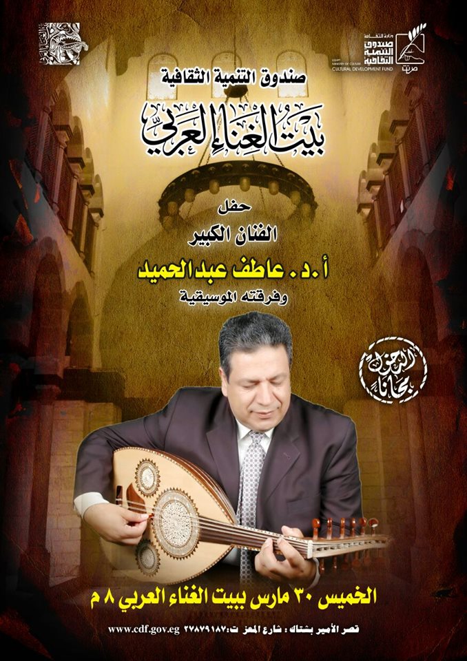 يقيم بيت الغناء العربي "بقصر الأمير بشتاك"، التابع لقطاع صندوق التنمية الثقافية برئاسة الدكتور أحمد عواض، في الثامنة مساء الخميس المقبل حفل الفنان الكبير الدكتور عاطف عبد الحميد وفرقته الموسيقية وريستال لأهم وأشهر المؤلفات الموسيقية.