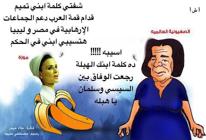 ومن جانبه صمّم علاء حيدر والرسام مصطفى عليوة، كاريكاتيراً يسخران فيه من الواقعة، وحديث بن تميم الداعم للجماعات الإرهابية في مصر وليبيا.