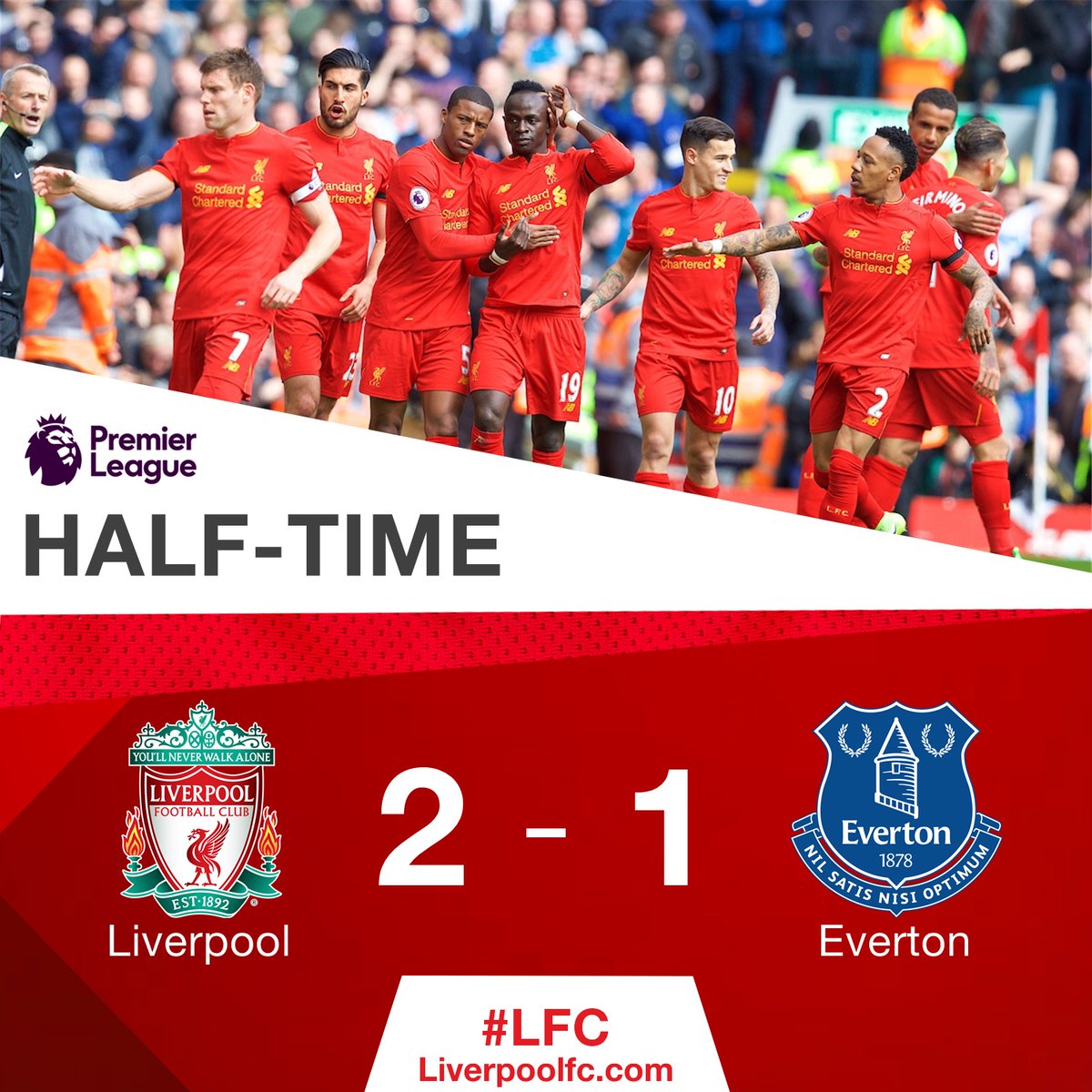 أنهى ليفربول الشوط الأول متقدما على نظيره إيفرتون بهدفين مقابل هدف فى مباراتهما المثيرة بالجولة الـ30 ضمن منافسات الدورى الإنجليزى لكرة القدم.