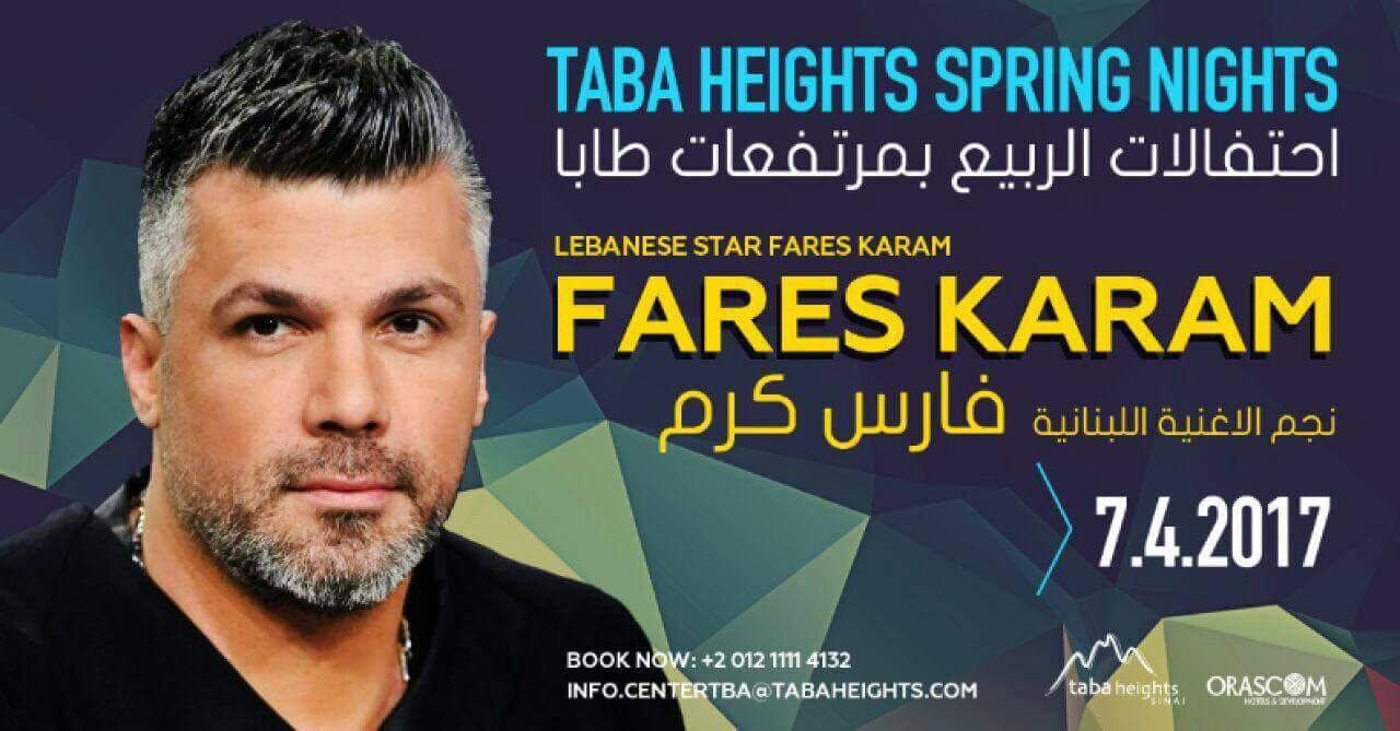 بدأ العد التنازلي لأكبر احتفالات فنية في طابا هايتس بجنوب سيناء، المقرر لها الفترة من 6 الى 8 ابريل 2017، بحضور الفنان معين شريف والنجم اللبناني فارس كرم، ونجم الأغنية الشعبية احمد الشوكي، والدويتو الشهير للفنان احمد مصطفى والفنانة شذى الهمشري نجمة أرب أيدول، بالاضافة الى الفقرات الاستعراضية التي تتضمن النجمة الاستعراضية الامريكية لونا والنجمة الاوكرانية شمس.