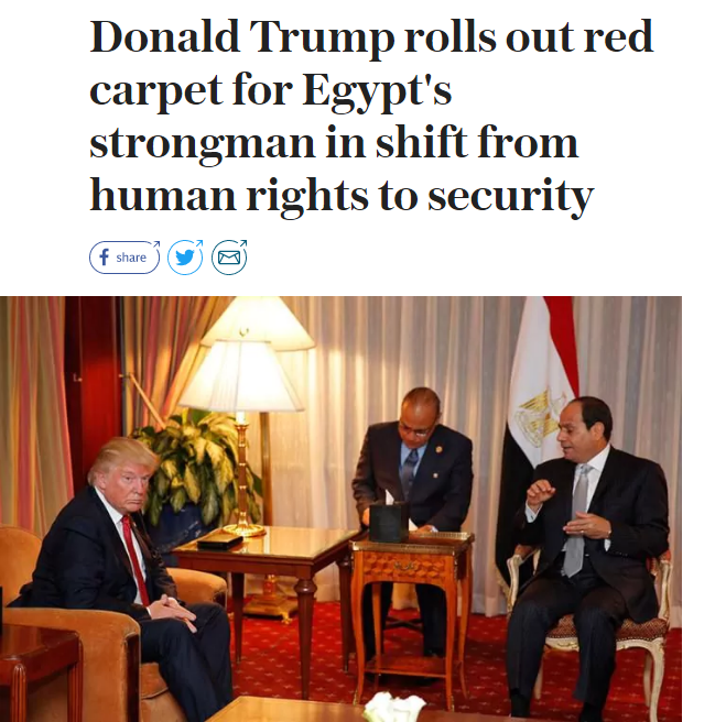 كتبت صحيفة "ديلي تليجراف" البريطانية معلقة على زيارة الرئيس المصري عبد الفتاح السيسي لواشنطن أن "دونالد ترامب يفرش السجادة الحمراء لرجل مصر القوي"، مشيرة إلى التحول في السياسات الأمريكية من "حقوق الإنسان إلى الأمن".