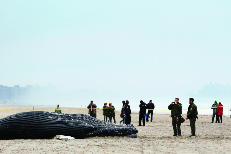 ظهر حوت أحدب عملاق على شاطئ روكاواي في حي كوينز بمدينة نيويورك، أول من أمس، يبلغ طوله 7.62 أمتار، كان قد رُصد أولًا يوم الاثنين من قبل خفر السواحل طافيًا على بعد عدة أميال من الشاطئ.
