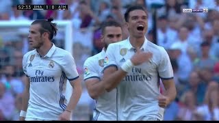 ومع الدقيقة 52 بطاقة صفراء من نصيب ساؤول نيجيز بعد لمسة يد متعمدة.. ونجح الريال فى افتتاح التسجيل فى الدقيقة 53 من عرضية لتونى كروس وصلت للمدافع البرتغالى بيبى الذى حول الكرة برأسه على يسار حارس مرمى أتليتكو أوبلاك.