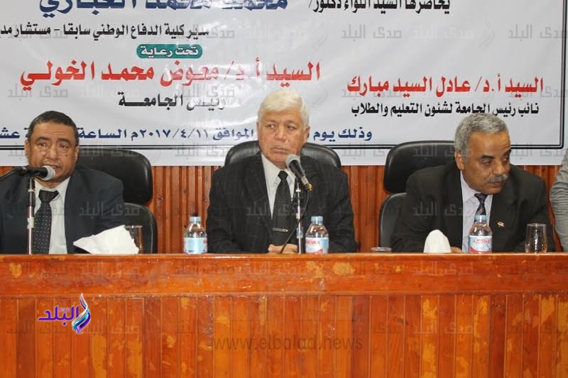 حاضر فيها اللواء دكتور محمد الغباري مدير كلية الدفاع الوطني سابقـًا ومستشار مدير أكاديمية ناصر العسكرية، وبحضور أسامة فاروق مندوب وزارة الشباب والرياضة، والدكتور بسيم عبد العظيم مدرس الأدب والنقد بقسم اللغه العربية، وعاكف بدر مدير عام رعاية الشباب، وعدد من الأساتذة وأعضاء هيئة التدريس والطلاب بالكلية.