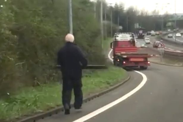 التقط أحد السائقين في بريطانيًا مشهدًا نادرًا ما يتكرر، حيث ظهر فيه رجل وهو يلاحق سيارة نقل ضخمة، وهو يلهث من طول المسافة حتى ارتطمت السيارة في الحاجز الأسمنتي على الطريق السريع.