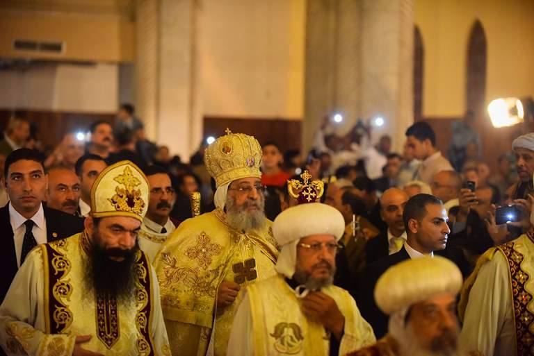 واستقبل المتواجدون بالكاتدرائية البابا تواضروس الثانى بابا الإسكندرية وبطريرك الكرازة المرقسية بالتهنئة لحظة دخوله والذى انتقلمن المقر البابوي إلى قاعة الاحتفالات الكبرى بالكاتدرائية وسط موكب ضم عددا كبير من الأساقفة والشمامسة وهم يرتدون ملابس خدمة العيد