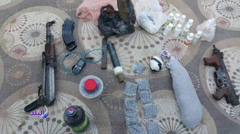 كما عُثر بحوزة المذكور على (بندقية آلية، ورشاش برتا، وخزينتين لبندقية آلية، وكمية من الذخائر، و3 عبوات متفجرة معدة للتجهيز، وكمية من رولمان البلي والأدوات والمواد الكيميائية التي تستخدم في تصنيع العبوات الناسفة.