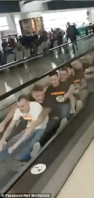 حيث ظهر مجموعة من 7 شباب يؤدون العرض الترفيهي، فى محاولة منهم لاستهلاك الوقت الطويل لانتظار الطائرة، وهم من مدينة "أنتريم" كانوا فى طريقهم إلى مدينة "براغ" التشيكية.