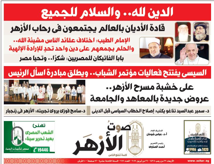 وتصدر العدد الجديد مقالًا للدكتور أحمد الطيب شيخ الأزهر، بعنوان "الحوار.. ومؤتمر السلام"، في الصفحة الأولى من الجريدة، كما تناولت الجريدة في الصفحة الأولى تغطية خاصة لزيارة بابا الفاتيكان، وتصريحات لشيخ الأزهر عن السلام بين الأديان وشعوب العالم، وتنويه لرسالة البابا فرنسيس، وتقديم التحية للشعب المصري، كما تضمنت الصفحة الأولى تنويه لمسرح الأزهر داخل المعاهد الازهرية والجامعة، وعدد من مقالات المثقفين والأقباط.