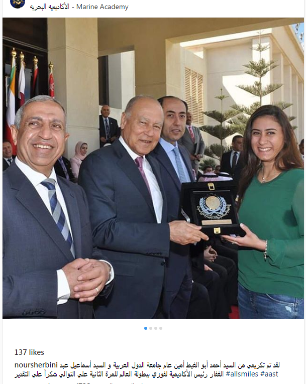 وعلقت نور على صورة نشرتها عبر حسابها على موقع التواصل الاجتماعى "انستجرام " قائلة: "تم تكريمى من أحمد أبو الغيط أمين عام جامعة الدول العربية وإسماعيل عبد الغفار رئيس الأكاديمية لفوزى ببطولة العالم للمرة الثانية على التوالى.. شكرا على التقدير.