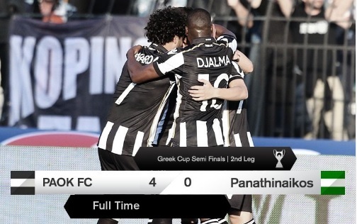 حقق فريق باوك سالونيك اليوناني فوزا كبيرا على فريق باناثينايكوس القوي بأربعة أهداف دون مقابل مساء اليوم الخميس في مباراة الاياب للدور قبل النهائي لبطولة كأس اليونان ليعوض هزيمته في لقاء الذهاب 2-0 ، ويتأهل للمباراة النهائية للبطولة.