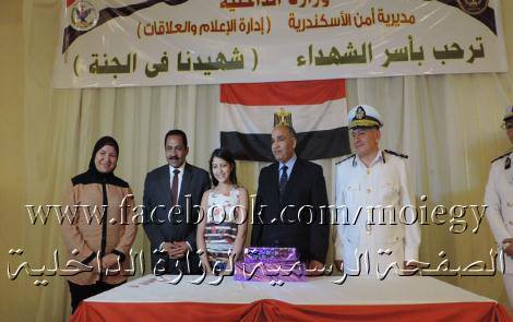 كرمت وزارة الداخلية، رجال الشرطة المتميزين وأبناء الشهداء والمصابين، حيث قدم اللواء على أبو زيد مساعد الوزير لمنطقة غرب الدلتا واللواء مصطفى النمر مدير أمن الإسكندرية بعض الهدايا التذكارية لأمهات وزوجات الشهداء فى احتفالية أقامتها مديرية أمن الإسكندرية لأسر الشهداء بنادى ضباط الشرطة بالنزهة.