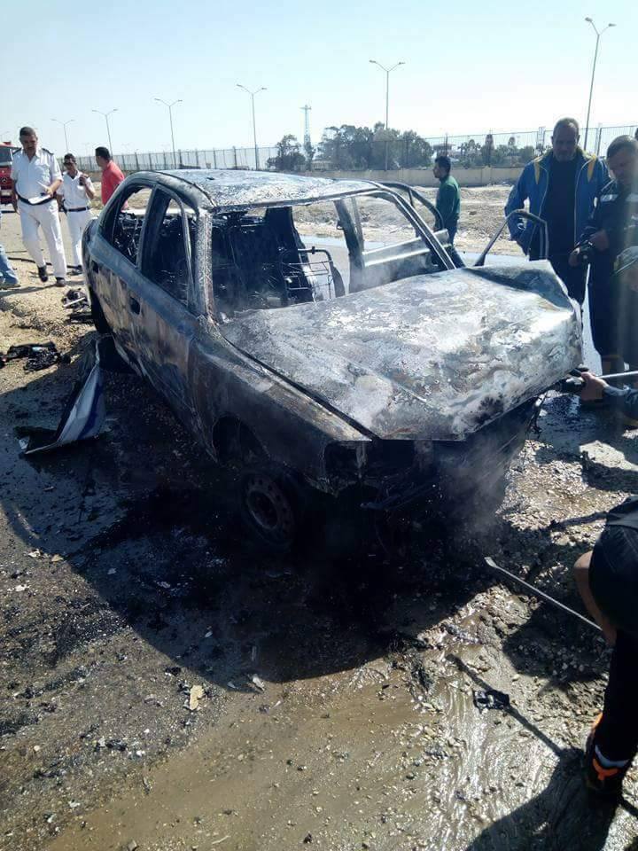 وقال أحد شهود العيان، إنه قد اصطدمت السيارة المحترقة بعمود إنارة على الطريق سالف الذكر؛ مما أدي إلى حريقها، وتحرر محضر بالواقعة.