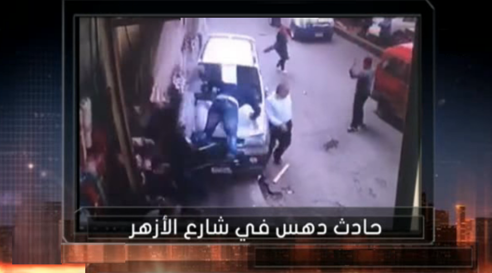 وظهر بالفيديو المتداول على مواقع التواصل وعرضه برنامج «90 دقيقة» على قناة «المحور»، قائد سيارة ينحرف بشكل عجيب عن الطريق ويقوم بالصعود على الرصيف بسيارته ليصدم مجموعة من أصحاب المحلات ويفر هاربا.